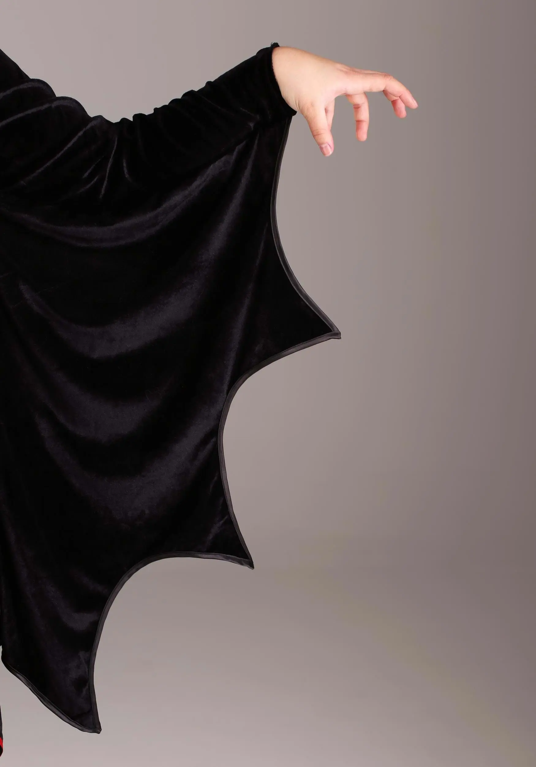 Spread your wings and soar in black and red wonder when you slip into this Lady Dracula costume. This is a Made By Us dress that will have you transformed in a snap. The dress is long-sleeved with silky wing panels that fasten to the length of the dress. When you raise your arms, the bat wings let you take flight! (Well, they look like they will, anyway. Actual supernatural powers aren’t included… yet.) Red trim creates sultry detail that matches with the collar you can tie at your neck.