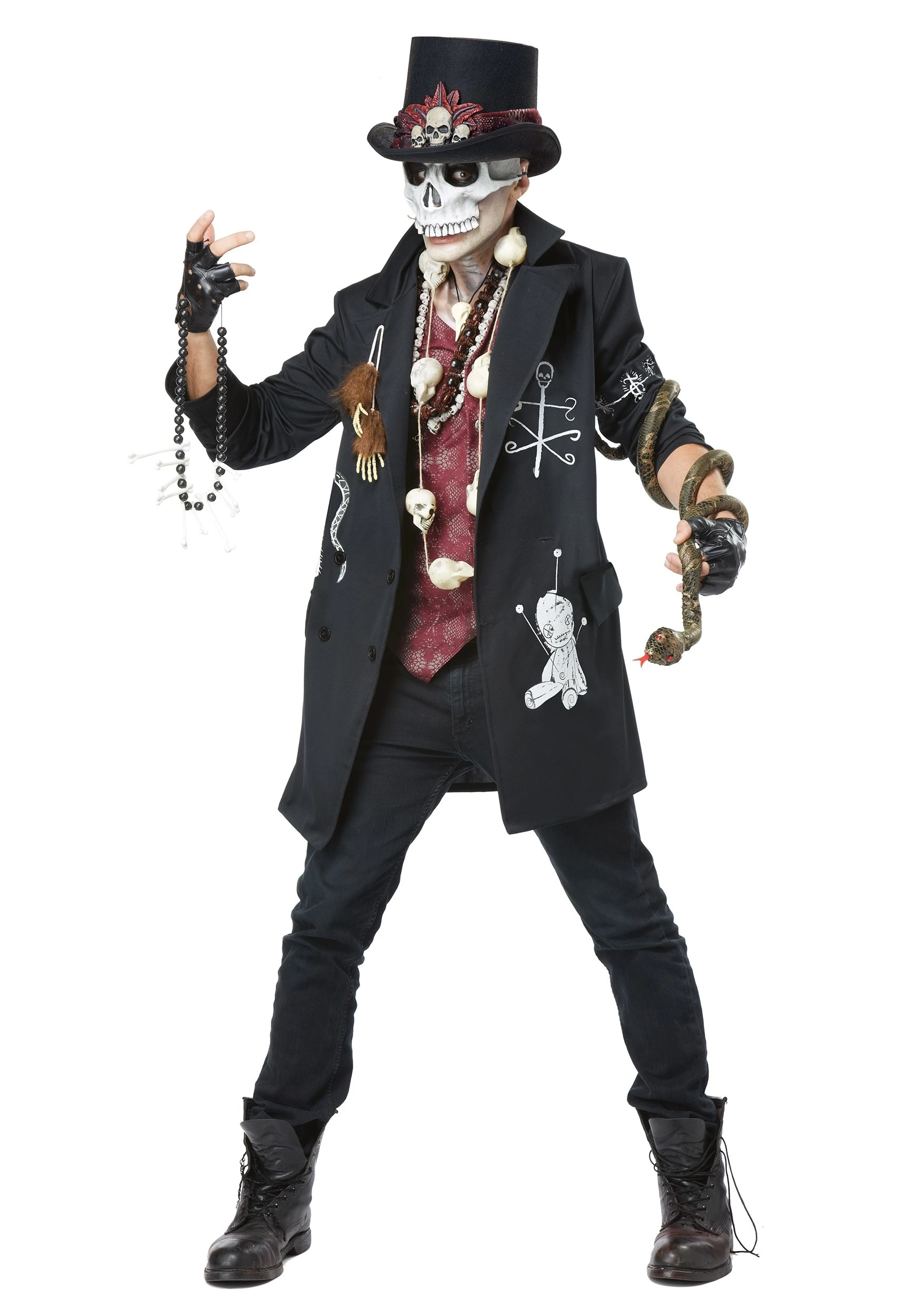 The Men’s Plus Size Voodoo Dude Costume will strike the fear of voodoo magic into your friends and foes. The foam hat with its sewn-on bones and faux gem is just tops. The molded mask covers the upper half of your face and is held on by an elastic band around the back of your head. The jacket is printed with graphics and includes the attached monkey hands hanging from cords. It fastens with center-front buttons, and the second row of buttons gives it a double-breasted look. After all, you want to look suave and spooky at the same time. Conveniently, the jacket has vest panels sewn directly into the sides and fastens with silver-tone filigree buttons. This ensemble does not include the rubber snake, gloves, or necklaces shown; those were gifts to us from Grandma. Sorry.