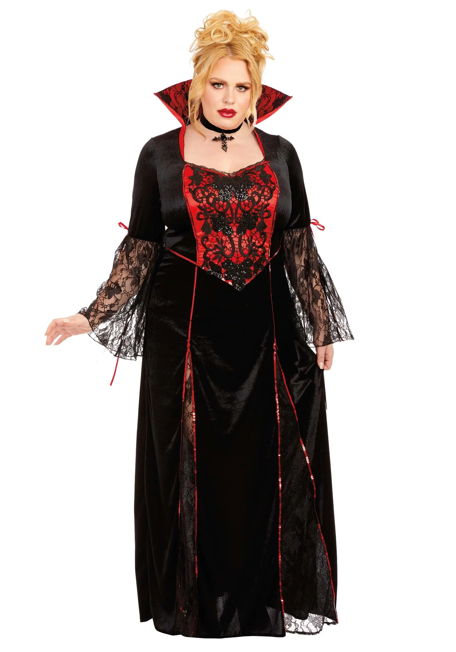 Rise from the coffin dressed for success with this plus-sized vampira costume. Valour, satin, and lace bring elegance and class to one of the most popular and classic costumes you’ll see on Halloween. The matching necklace accentuates the dress perfectly and protects your own neck from vampire attacks.