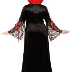 Watch out, everyone: Here comes trouble wearing a Princess of Darkness Girl’s Costume! The cold-shoulder style black jumpsuit is made of a blend of polyester and spandex, and has a shiny finish. It zips up the front and features a stand-up red collar that looks like an old-fashioned ruff. Elastic finger loops are attached to each pointed sleeve cuff. An open-front crimson skirt is sewn to the back of the waist. Red reverse-scallop edging decorates the waist’s front.Â