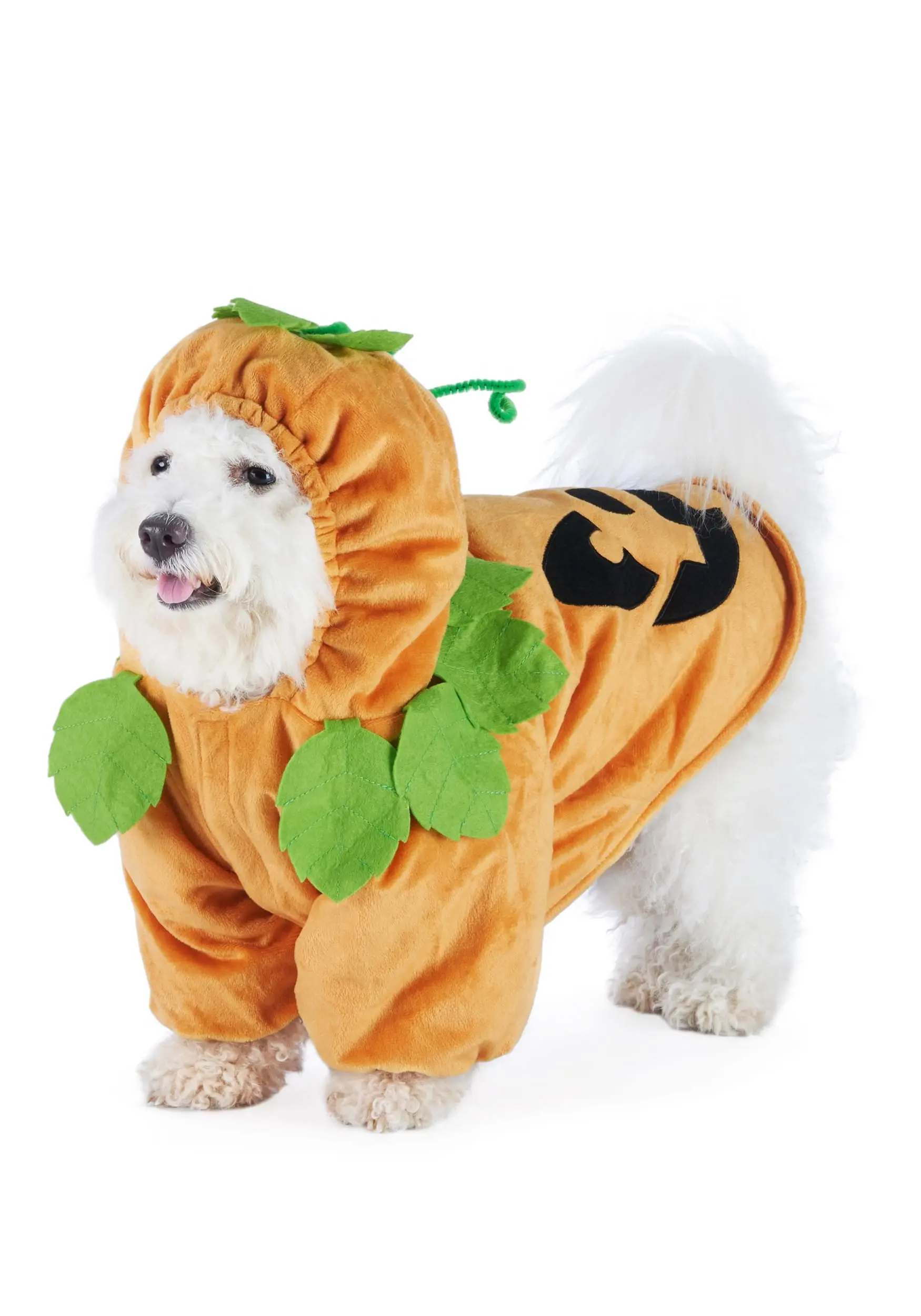 Roly poly puppers were made to dress up as pumpkins on Halloween! This costume is adorably cute and has all the details to help your Jack (or Jill)-o-lantern stand out in the middle of the pumpkin patch. A “carved” face, leafy collar, and even a stem on the head are the attention to detail you’re looking for when you want to take first prize at the costume party. Elastic around the head opening keep things in place, and hook and loop fasteners along the underside make putting this costume on as easy as possible.