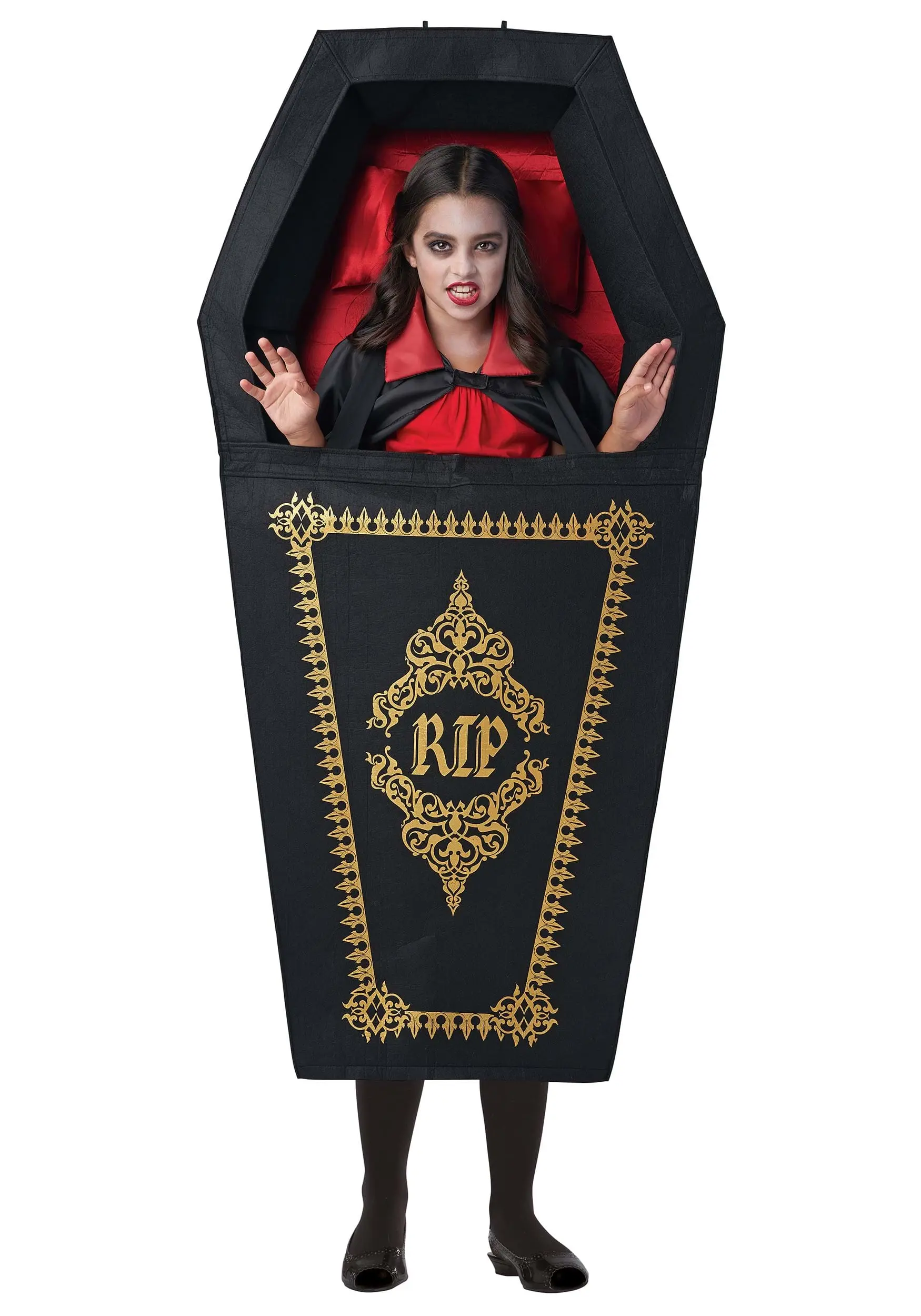 Ever heard of Sleeping Beauty? Well, with this Vampire Casket Costume for Kids, you get to be Sleeping Scary! The unisex costume includes a full-sized yet lightweight tunic shaped to look like a stiff-sided balck coffin. It’s printed with gold detail on the front, including faux embossing and the letters “RIP.” Attached black shoulder straps keep it securely in place, while the red backing makes it look as though you’re resting against a satin coffin interior.Â